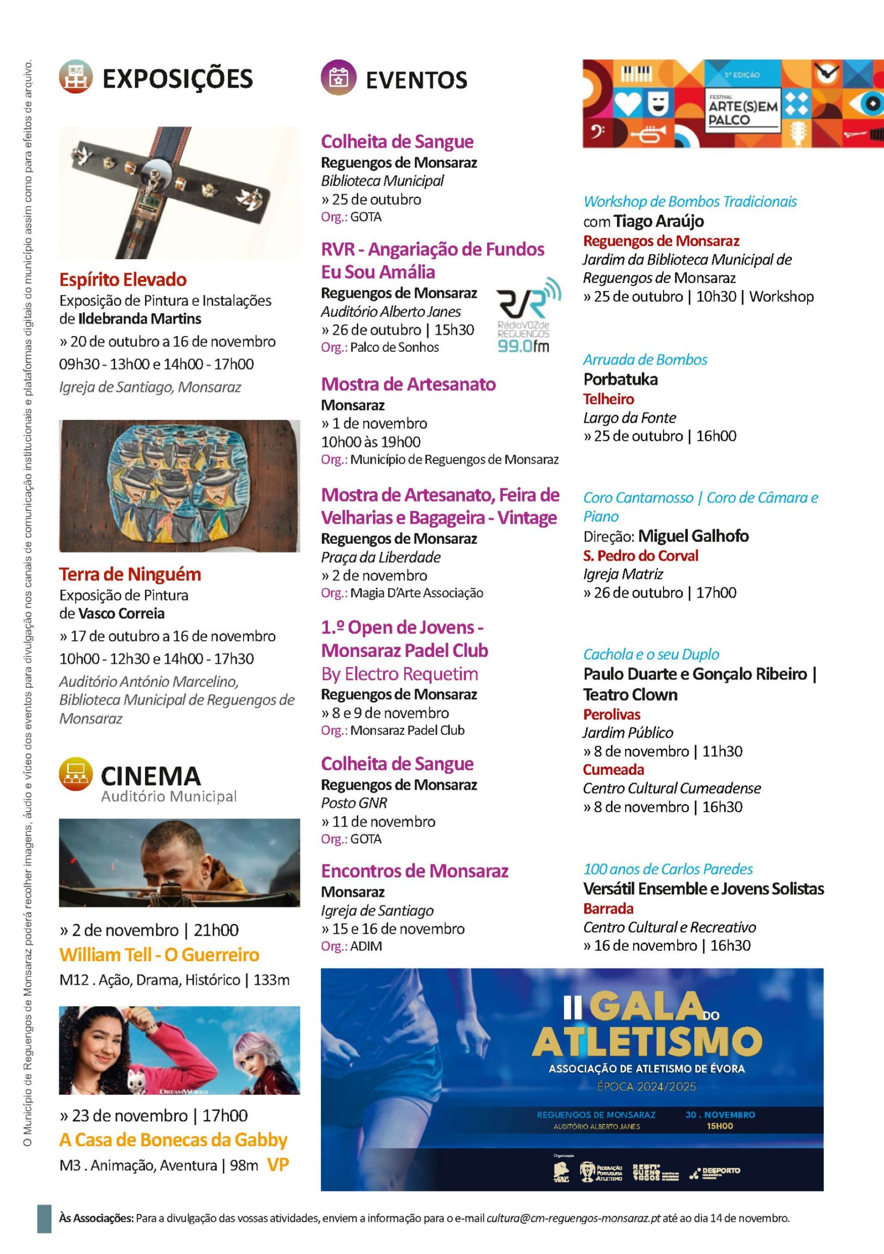 Agenda Cultural de outubro e novembro de 2025 em Reguengos de Monsaraz