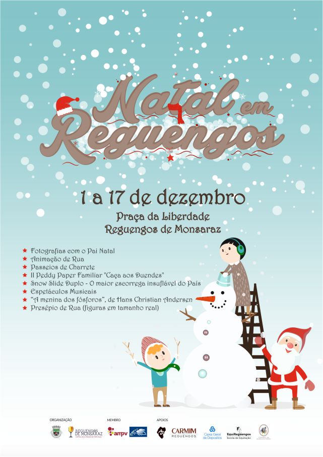 Animação de rua, insufláveis, canhão de neve, ateliers, distribuição de brindes, pipocas, tatuagens glitter, música, teatro, exposições, cicloturismo e muito mais nesta temporada natalícia.