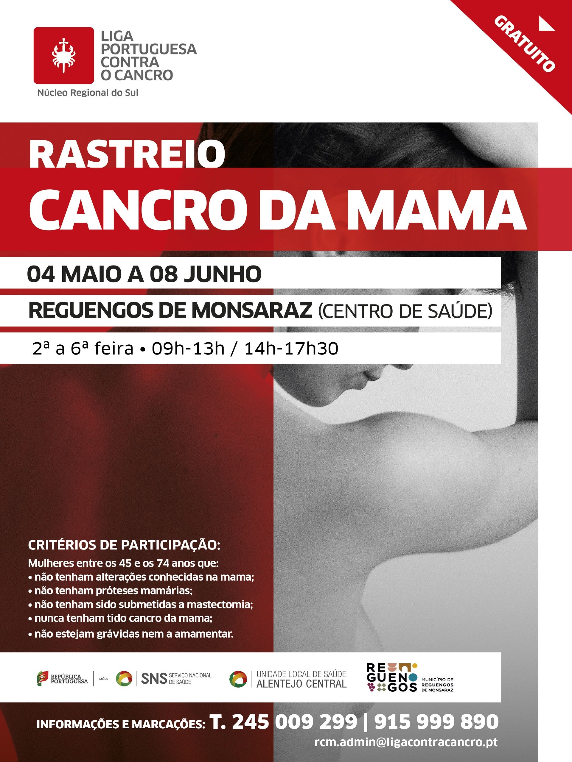 A Liga Portuguesa Contra o Cancro (LPCC), através do Núcleo Regional do Sul, promove uma iniciativa de rastreio de cancro da mama em Reguengos de Monsaraz. A unidade móvel estará disponível entre os dias 04 de maio e 08 de junho, no Centro de Saúde de Reguengos de Monsaraz.